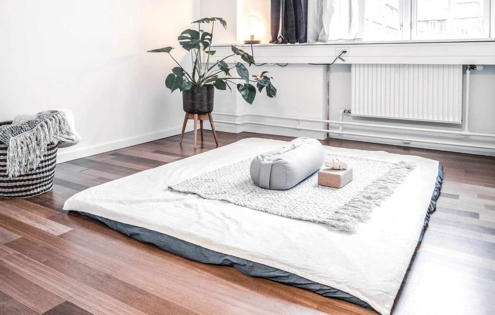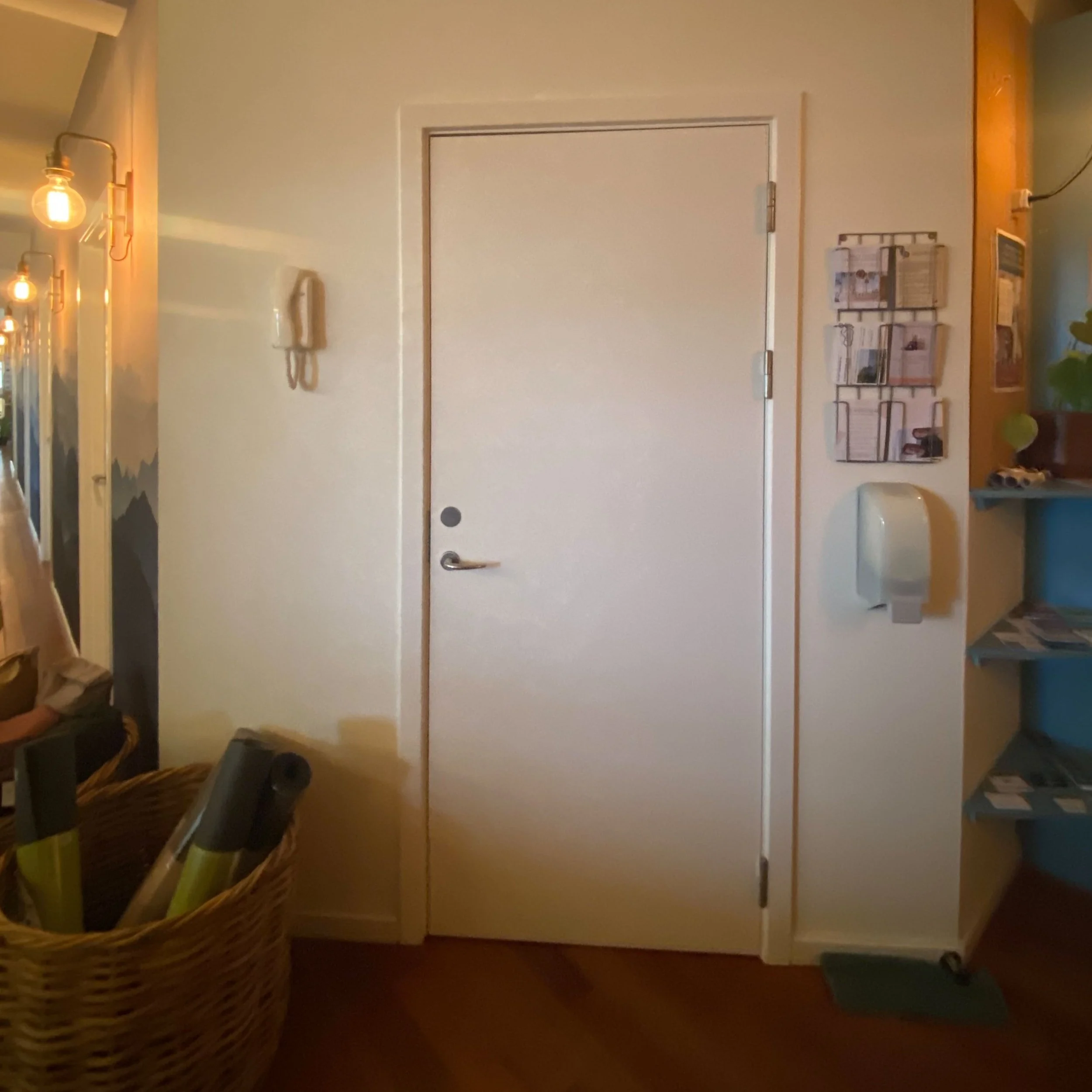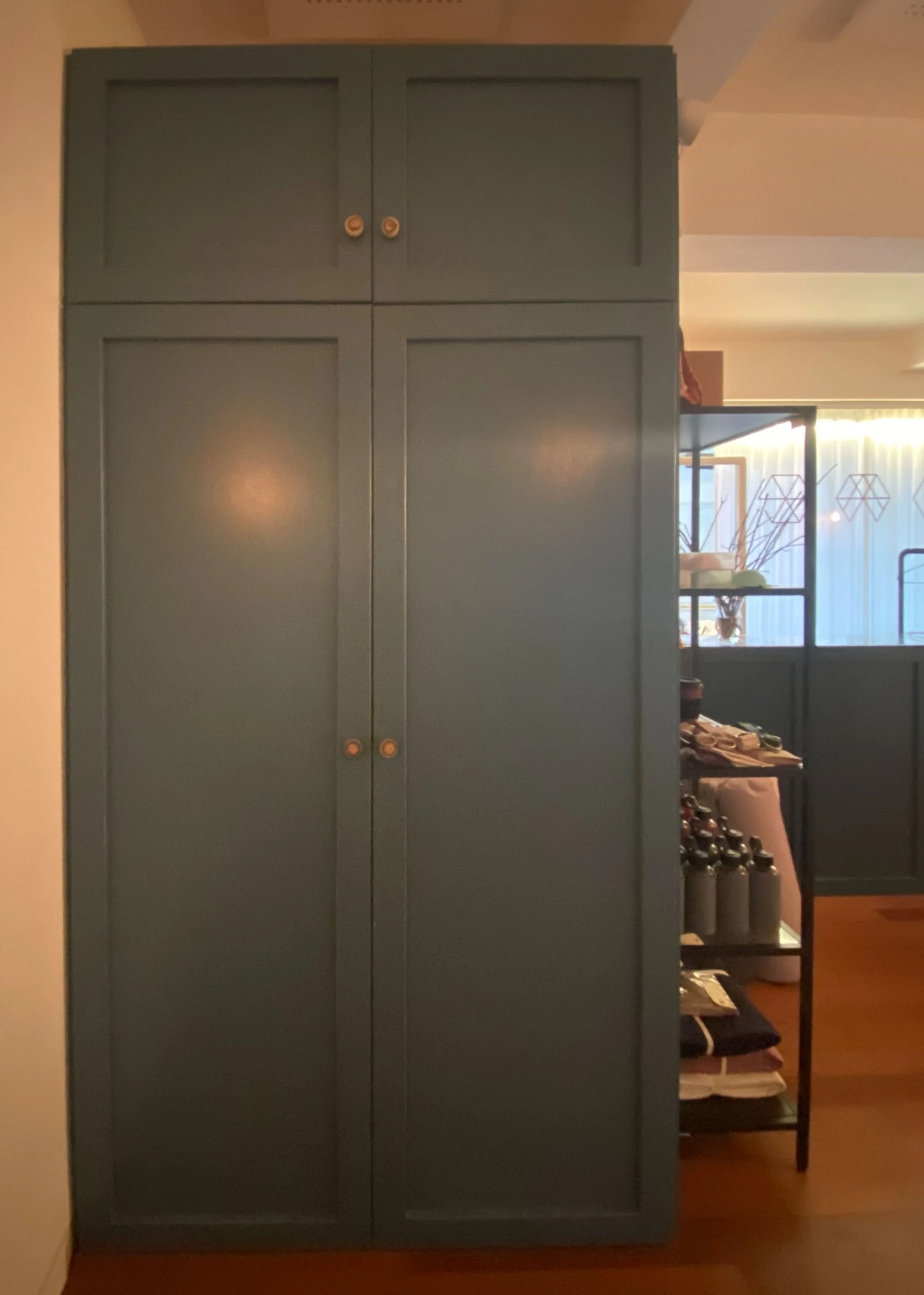 Gulvmadrasser, bakkeborde og ‘producer-stole‘ findes i de blå skabe ved receptionen.
