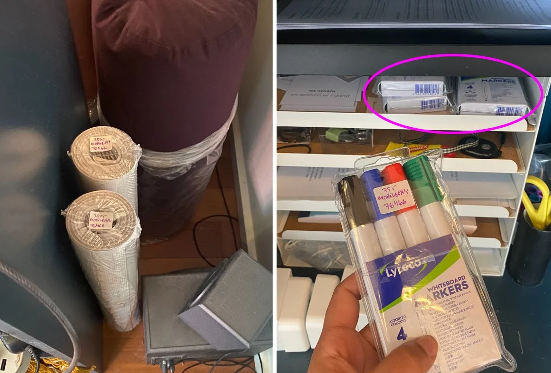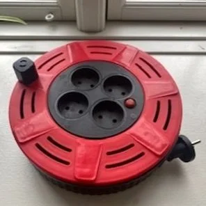 Projektor, clipboards, kabeltromle, forlængerledninger og øjenpuder findes også i de blå skabe ved receptionen.