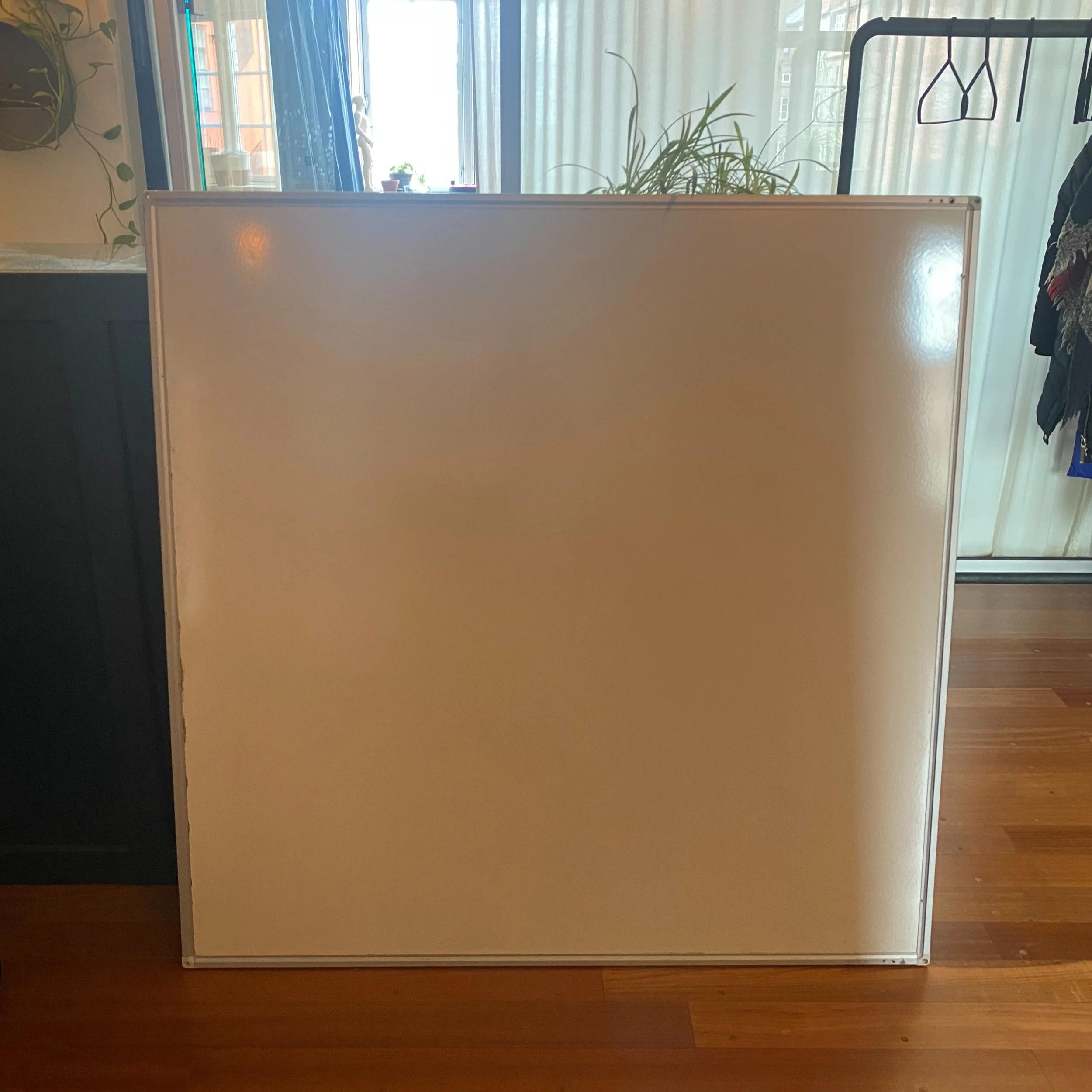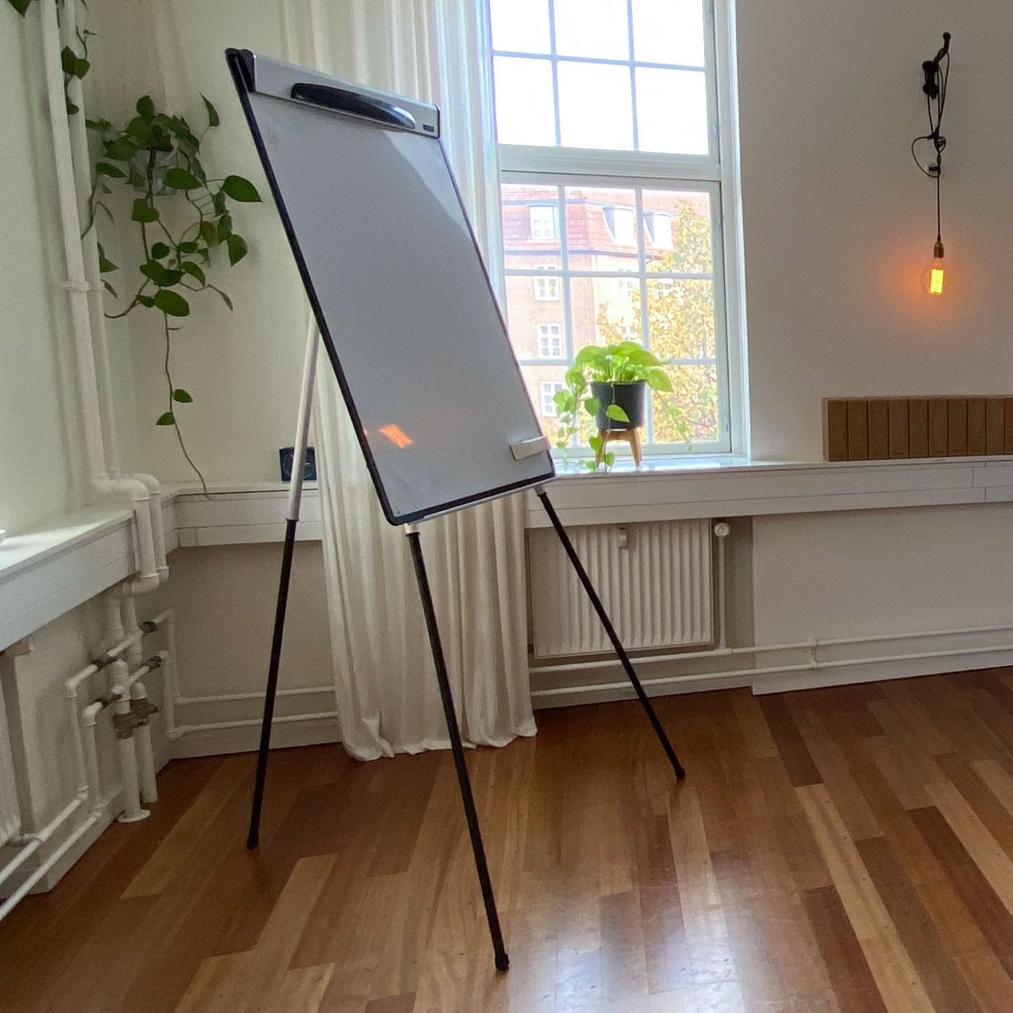 Whiteboard og flipover findes i “rengøringsskabet” ved receptionen