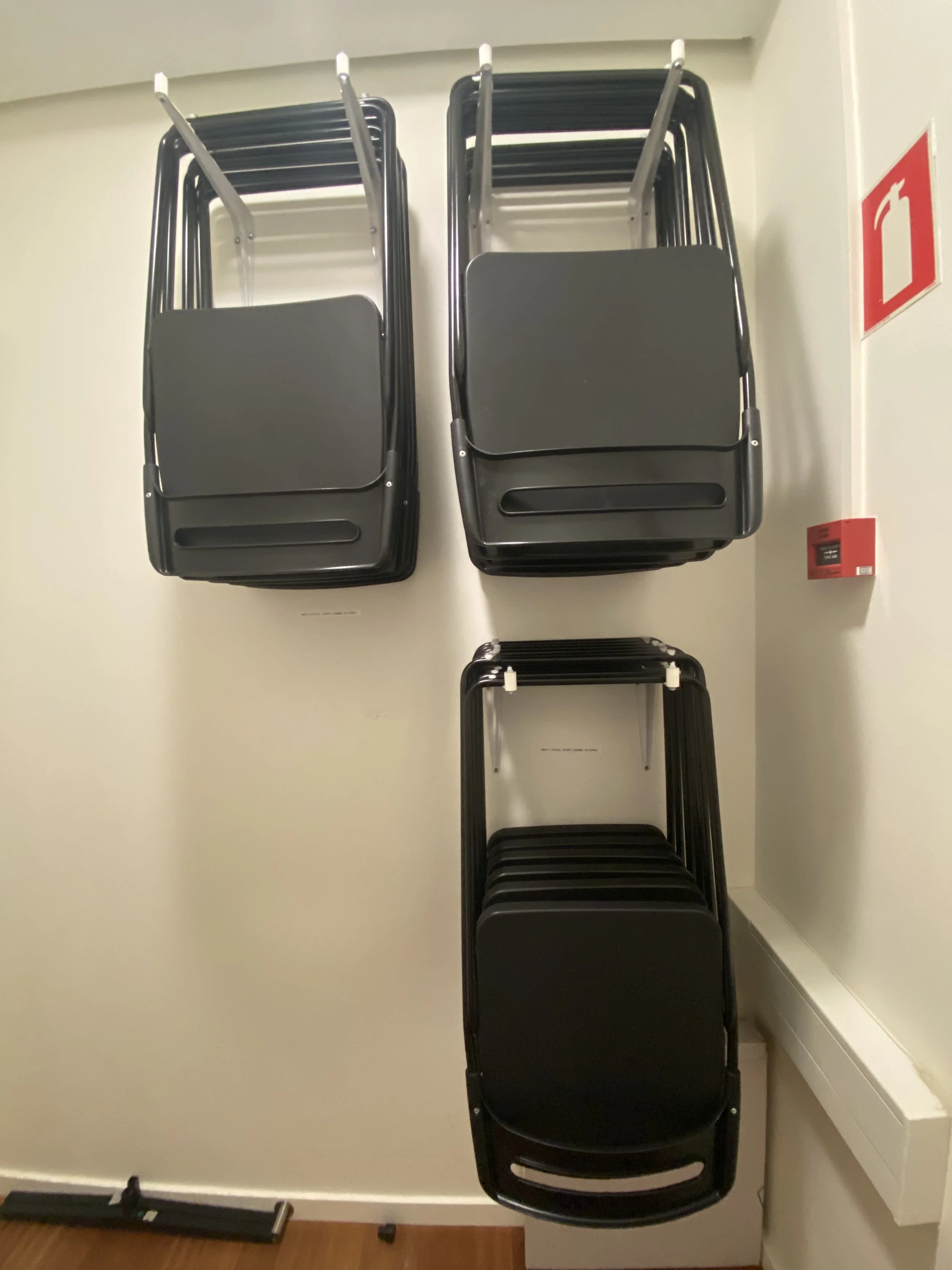 Husk at hænge dem pænt på plads efter brug i samme retning. Dvs. at de vender ens, ellers er der ikke plads til dem alle.Vær opmærksom på at hænge stolene stille på plads, hvis der er en session i gang i sal 2, når du rydder op.