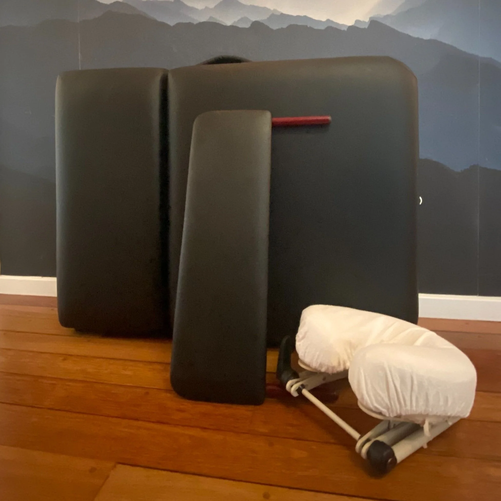 Klapstolene med sølvstel findes i skabet ved receptionen.